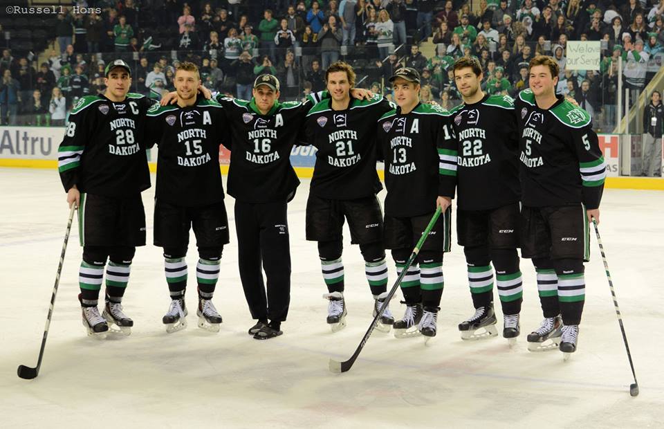 Seniors on UND men’s hockey team (15-5-2 in the National Collegiate Hockey Conference and 24-6-3 overall) went out in style Saturday night at Ralph Engelstad Arena in Grand Forks, N.D., defeating St. Cloud State (10-11-1 in NCHC and 15-16-1 overall) 3-1 in front of more than 12,000 fans to clinch a sweep of the weekend series and a share of the Penrose Cup as NCHC regular-season champions.