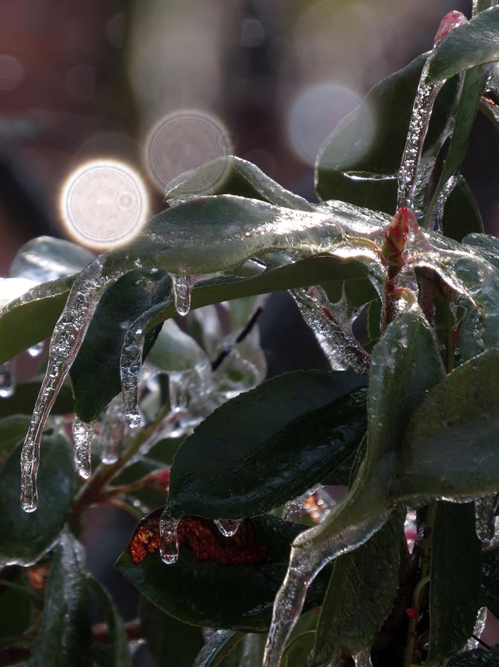 The sun melts ice covering the leaves on a magnolia tree this morning in the neighborhood of Del Ray in Alexandria, Va.
