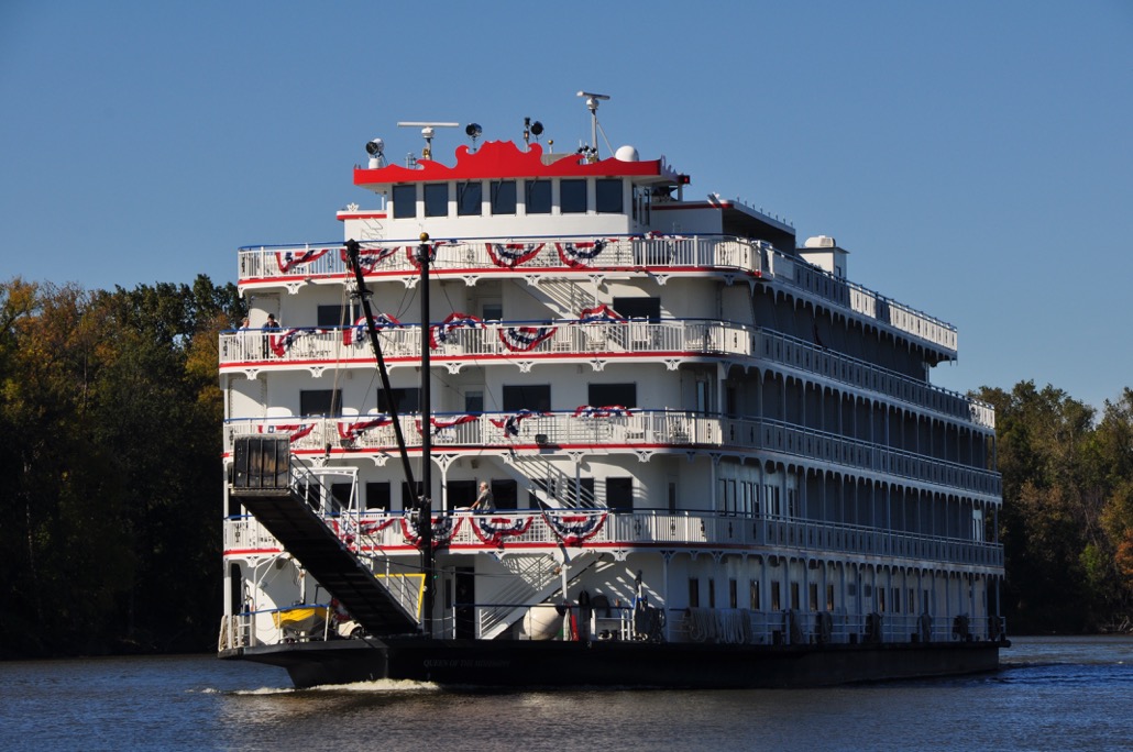 Now back to our boat ride. Although the colors were not yet at peak, we witnessed mile after mile of mostly beautiful sights — the regal Queen of the Mississippi, a five-tiered paddle boat decked out in red, white and blue full fan buntings with a faux water wheel in back. We passed a few other boats but my favorite was a smaller, fully restored Chris Craft beauty with its polished reddish wooden bow and upper sides.