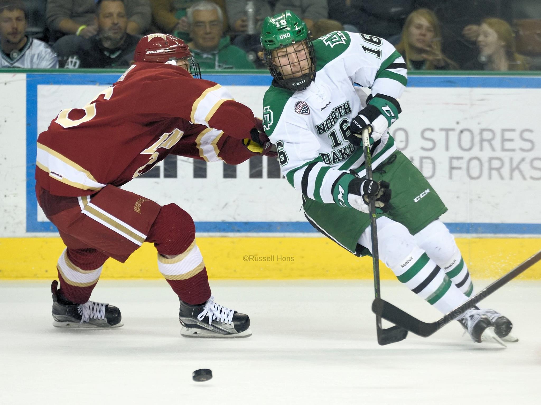 Austin Poganski scored two goals — the first with less than one second left in the first period — and the “CBS” line of Drake Caggiula, Brock Boeser and Nick Schmaltz chipped in two more as the University of North Dakota men’s hockey team shut out Denver University 4-0 on Saturday night in Ralph Engelstad Arena. Caggiula and Boeser each scored a goal, and Schmaltz had two assists. Goalie Cam Johnson had 18 saves in his first career shutout. DU goalie Tanner Jaillet had 33 saves. The Fighting Hawks improved their league-leading National Collegiate Hockey Conference record to 7-1 (14-2-2 overall), while the Pioneers fell to 3-2-1 and 7-5-2. The game was played before a sell-out crowd of 11,842 fans. Check out more photos from Russ Hons here.