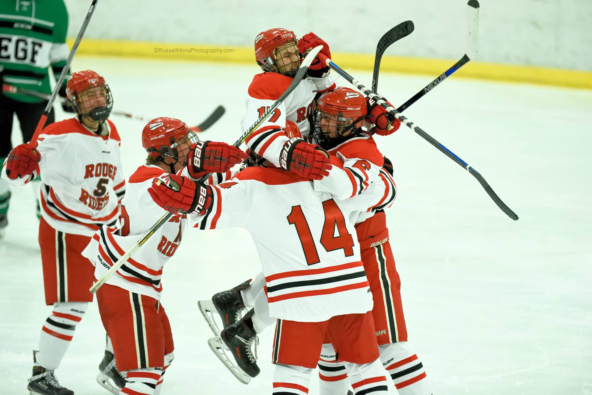 Grand Forks Red River High School’s boys hockey team took a big step toward bringing the Gambucci Cup back to North Dakota on Tuesday night as the Roughriders edged East Grand Forks Senior High 4-3 in Purpur Arena in Grand Forks. After a win Saturday against Grand Forks Central, Red River (7-0) is now 2-0 in the cup race, while the Green Wave (7-3-1) are 1-1. Central is 0-2. The Riders jumped out to a 1-0 lead in the first period on a goal by Max Miller but trailed 2-1 after two periods, thanks to Green Wave goals by Trevor Selk and Braden Shea. However, three straight goals by Jack Tannahill, Kaden Landa and Tony Haley to open the third period gave Red River a lead it would not relinquish. Casey Kallock scored the final Senior High goal. Riders’ goalie Adam Van Raden stopped 17 shots, while Green Wave netminder Jared Reak had 26 saves. Check out more photos from Russ Hons here.