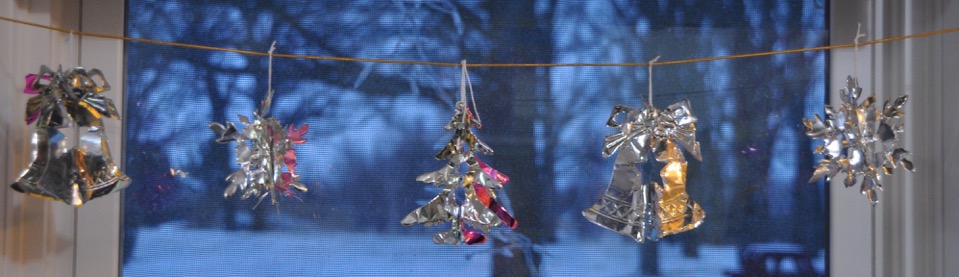 For a change, I tape many old felt decorations handmade by various family members on the living room windows. Not visible from the gravel road that passes our place, you have to get up close and personal to see them.