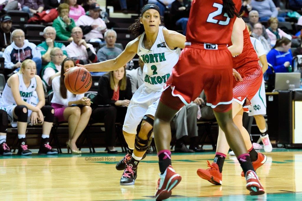The University of North Dakota women’s basketball team picked up its seventh-straight win, a 72-69 Big Sky Conference victory over Eastern Washington University on Thursday in the Betty Engelstad Sioux Center. Four players hit double figures in scoring for the Fighting Hawks, who upped their conference mark to 8-4 and overall mark to 12-11. Senior Mia Loyd led UND with 18 points and 10 rebounds for her 33rd career double-double and eighth of the season. Makailah Dyer chipped in 13 points, and Lexi Klabo and Leah Szabla each scored 10. EWU was led by sisters Hayley Hodgins (27 points) and Delaney Hodgins (18). The Vandals fell to 9-3 in the Big Sky and 17-7 overall. The Fighting Hawks return to action at 2 p.m. Saturday, hosting the University of Idaho (9-3 BS, 17-7 overall), a 70-68 overtime winner at Northern Colorado on Thursday. Check out more photos from Russ Hons here.