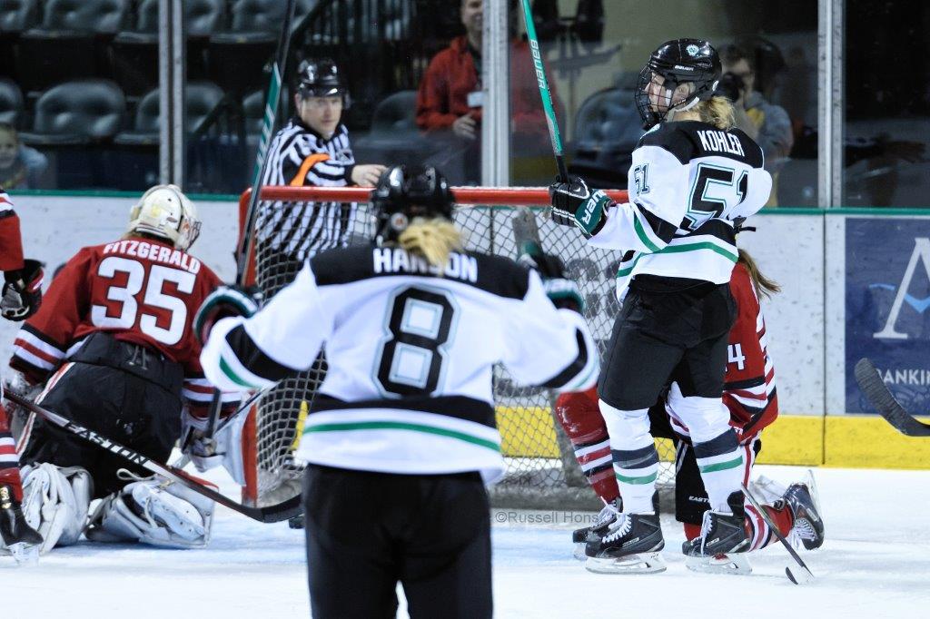 Meghan Dufault, Becca Kohler and Amy Menke totaled eight points, including five goals, as the University of North Dakota women’s hockey shut out St. Cloud State University 6-0 Saturday afternoon in Ralph Engelstad Arena. By sweeping the Western Collegiate Hockey Association playoff series, the Fighting Hawks clinched their sixth-straight WCHA Final Face-Off appearance. UND won 6-1 Friday. With the sweep, the Fighting Hawks are now 12-1 in first-round playoff games since 2010-11. It also marks the first weekend sweep of the season since Jan. 15-16. North Dakota improved its record to 18-11-5 and will enter the 2016 Final Face-Off as the tournaments third seed. Kohler and Menke each scored two goals for UND and Dufault and Charly Dahlquist each scored once. In goal, UND’s Shelby Amsley-Benzie made 22 stops, while UMD’s Katie Fitzgerald had 23. North Dakota will play in the semifinals at the 2016 WCHA Final Face-Off on March 5 in Ridder Arena in Minneapolis. The two semifinals are set for 2 and 5 p.m. The championship game will be held at 2 p.m. March 6.
