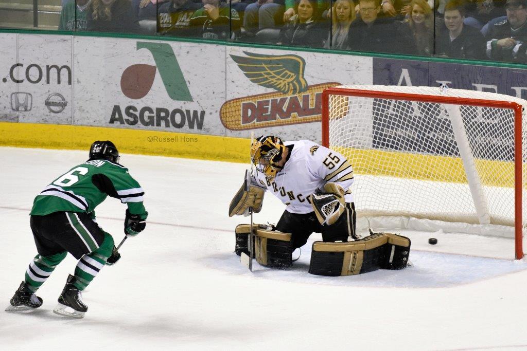 The University of North Dakota clinched its second straight National Collegiate Hockey Conference championship and Penrose Cup with an 8-1 win over Western Michigan University on Friday night in Ralph Engelstad Arena in Grand Forks. The Fighting Sioux were paced by its top line of Brock Boeser, Nick Schmaltz and Drake Caggiula. Boeser had two goals and two assists, Schmaltz had his second four-point game (goal, 3 assists) of the season, while Caggiula had one assist for a nine-point game for the CBS line. Coltyn Sanderson and lineman Chris Wilke also scored two goals for UND, 27-5-3 overall and 18-4-1 in the NCHC. Paul LaDue scored other UND goal. Sheldon Dries scored WMU’s lone goal. Fighting Sioux goalie Cam Johnson stopped 31 shots, while WMU’s Trevor Gorsuch and Lukas Hafner combined for 27 saves. The two teams meet again tonight. Check out more photos from Russ Hons here.