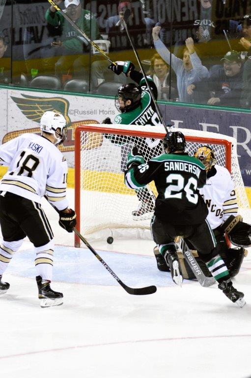 Five different players scored as the University of North Dakota men’s hockey team came from behind to beat Western Michigan University 5-4 on Saturday night in Ralph Engelstad Arena. The win gave the Fighting Hawks, 28-5-3 overall and 19-4-1 in the National Collegiate Hockey Conference, their 11th series sweep this season and moved them to No. 1 in the Pairwise Rankings, ahead of Quinnipiac University. On Senior Night, two of the five honorees — Drake Caggiula and Bryn Chyzyk — scored for UND. Also potting goals for the Fighting Hawks were freshmen Brock Boeser and Shane Gersich and junior Troy Stecher. Colt Conrad, Michael Rebry, Griffen Molino and Nolan LaPorte scored for the Broncos, 8-22-3 overall and 5-18-1 in the NCHC. UND goaltender sophomore Cam Johnson had just one save, allowing three goals, before being pulled in favor of junior Matt Hrynkiw, who made 16 saves. Lukas Hafner stopped 22 UND shots for WMU. Check out more photos from Russ Hons here.