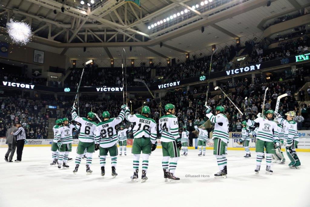 The University of North Dakota men’s hockey team said goodbye for another season to Ralph Engelstad Arena on Saturday night, easily handling Colorado College 5-1 to sweep its National Collegiate Hockey Conference playoff series with the Tigers, sending the Fighting Hawks to this weekend’s Frozen Faceoff in Minneapolis, where they will meet the University of Minnesota-Duluth at 7:38 p.m. Friday in Target Center. North Dakota (30-5-3) received first-period goals from Nick Schmaltz, Joel Janatuinen, Hayden Shaw and Drake Caggiula and never looked back. Austin Polanski and CC’s Matt Hansen traded goals in the second period to round out the scoring. Cam Johnson made 22 saves in goal for UND, while Jacob Tehama and Derek Shatzer combined to stop 23 Fighting Hawks shots. Colorado College ended its season with a 6-29-1 record. Check out more photos from Russ Hons here.