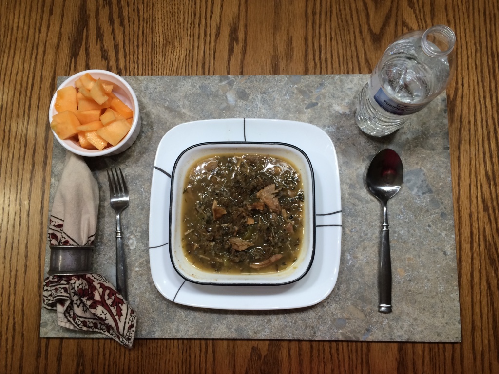 Homemade chicken and wild rice soup with sautéed onions, cantaloupe and water. The wild rice takes the place of one piece of rye bread.