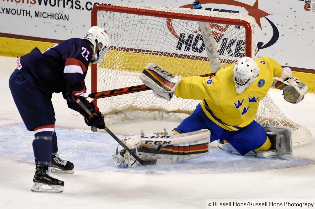 Team USA used balanced scoring to defeat Team Sweden 6-1 in pool play of the IIHF World Under-18 Championship on Saturday afternoon in Ralph Engelstad Arena. The win upped USA’s record to 2-0, while Sweden has now lost once and won another in overtime. Casey Mittelstadt, Kieffer Bellows, Ryan Lindgren, James Greenway, Keegan Howdeshell and Joey Anderson each scored for Team USA. Timothy Liljegren scored the Swede’s only goal. Joseph Woll had 34 saves in goal for the Americans. Filip Larsson stopped 18 shots for Sweden. Check out more photos from Russ Hons here.