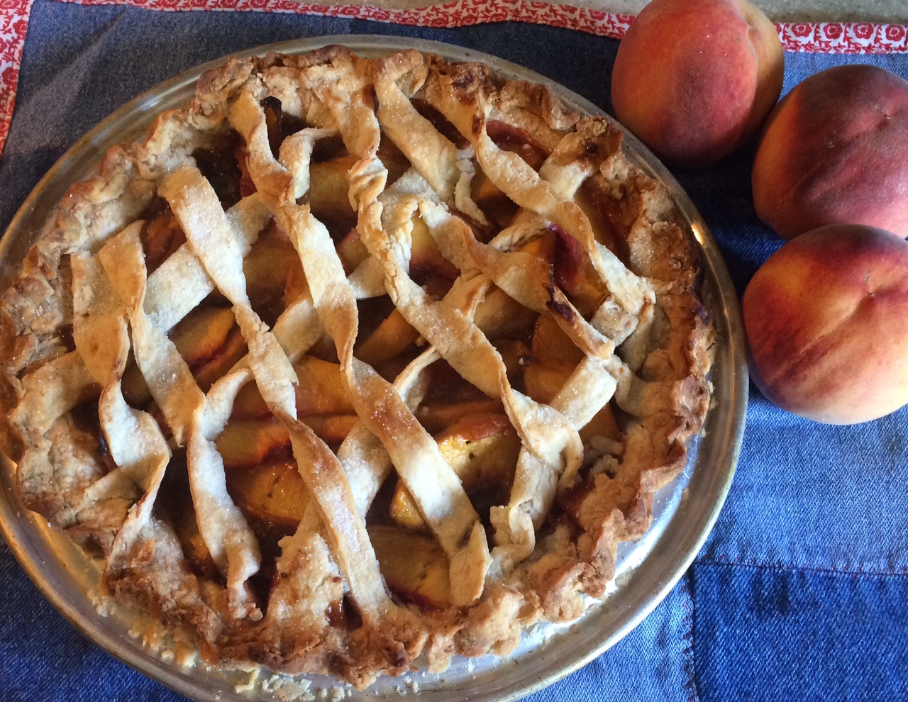 While the peaches came a little late in the day for Therese to make one of her mouth-watering pies forthwith, she did manage to artfully craft one Thursday. And was it ever good!