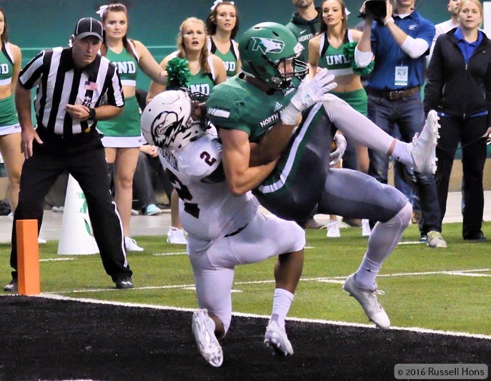 The University of North Dakota, behind quarterback Keaton Studsrud’s four touchdowns passes, defeated Southern Utah University 45-23 on Saturday in Grand Forks’ Alerus Center to remain perfect at 4-0 in the Big Sky Conference football standings. Studsrud was 20-for-27 through the air for 282 yards in the 2016 Homecoming victory as the Fighting Hawks won their fifth straight game after opening the season with two close losses. The victory over the Thunderbirds (3-3, 2-2 BSC) gave UND its first five-game winning streak during the program’s Division I era and first overall since opening the 2007 campaign with six-consecutive victories. That was the team’s final season at the Division II level. Fullback Kyle Norberg led UND in rushing with 73 yards on six carries, while Brady Oliveira added 64 yards on the ground and John Santiago 56. Both Oliveira and Santiago scored touchdowns. Studsrud’s touchdown passes were to Luke Stanley, Noah Wanzek, De’mun Mercer and Travis Toivonen. The Fighting Hawks return to Big Sky play on Saturday at Idaho State. Check out more photos from Russ Hons here.