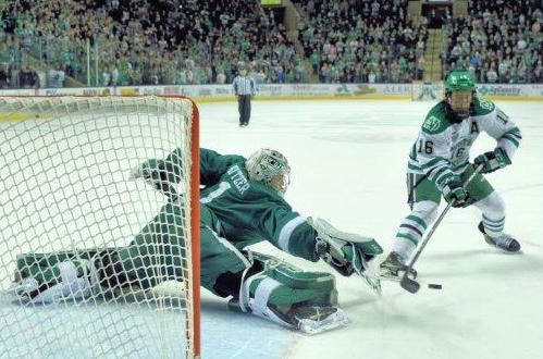 The University of North Dakota men’s hockey team surrendered two first-period goals to Bemidji State University on Friday night in Ralph Engelstad Arena, and things were looking a little bleak for the home team. But fueled by sophomore Brock Boeser’s natural hat trick — the third goal coming on a penalty shot a 12:52 of the third period — the Fighting Hawks edged the Beavers 3-2 before 11,816 fans to run their record to 4-0 on the season. The Beavers lost for the first time this season, falling to 4-1. Phillip Marinaccio and Brett Beauvais scored early for BSU to put UND in the hole, but Boeser, a first-round draft pick of the Vancouver Canucks of the National Hockey League, scored on a second-period power play and at even strength early in the final frame to set up his winning tally. BSU goalie Michael Bitzer from Moorhead had 33 saves, while Cam Johnson stopped 16 shots. The two teams meet again tonight at 7:10 in REA. Check out more photos from Russ Hons here.