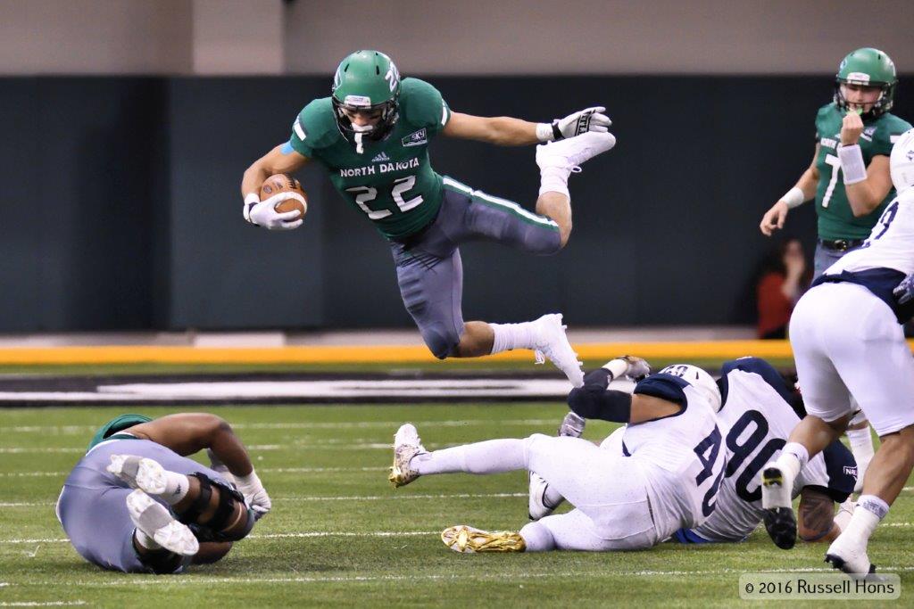 The University of North Dakota clinched a share of the Big Sky Conference football championship Saturday in the Alerus Center with a 38-31 win over visiting Northern Arizona University. But if you would have told that to Fighting Hawks fans in attendance after the first half, you might not have gotten many believers. UND erased a 31-10 lead in the third quarter, scoring 28 unanswered points, capped by Deion Harris’ 40-yard interception return for a touchdown with only 2:43 left in the game, to claim the victory, their ninth straight after opening the season with two losses. The win allowed UND to finish off Big Sky play with a perfect 8-0 record and a good shot at a NCAA FCS Playoff game. The win closed out the regular season for the Fighting Hawks, who will have next weekend off before learning if they will make postseason play. The Hawks (9-2 overall, 8-0 BSC) were led by quarterback Keaton Studsrud, who passed for 254 yards and one touchdown and wide receiver De’mun Mercer, who had seven catches for 147 yards and a touchdown. Running back John Santiago chipped in 77 yards and two scores on the ground, and Brady Oliveira ran for 103 yards and threw for one touchdown. NAU (5-5, 4-3 BSC) was led by quarterback Blake Kemp, who threw for 416 yards and three touchdowns. Check out more photos from Russ Hons here.
