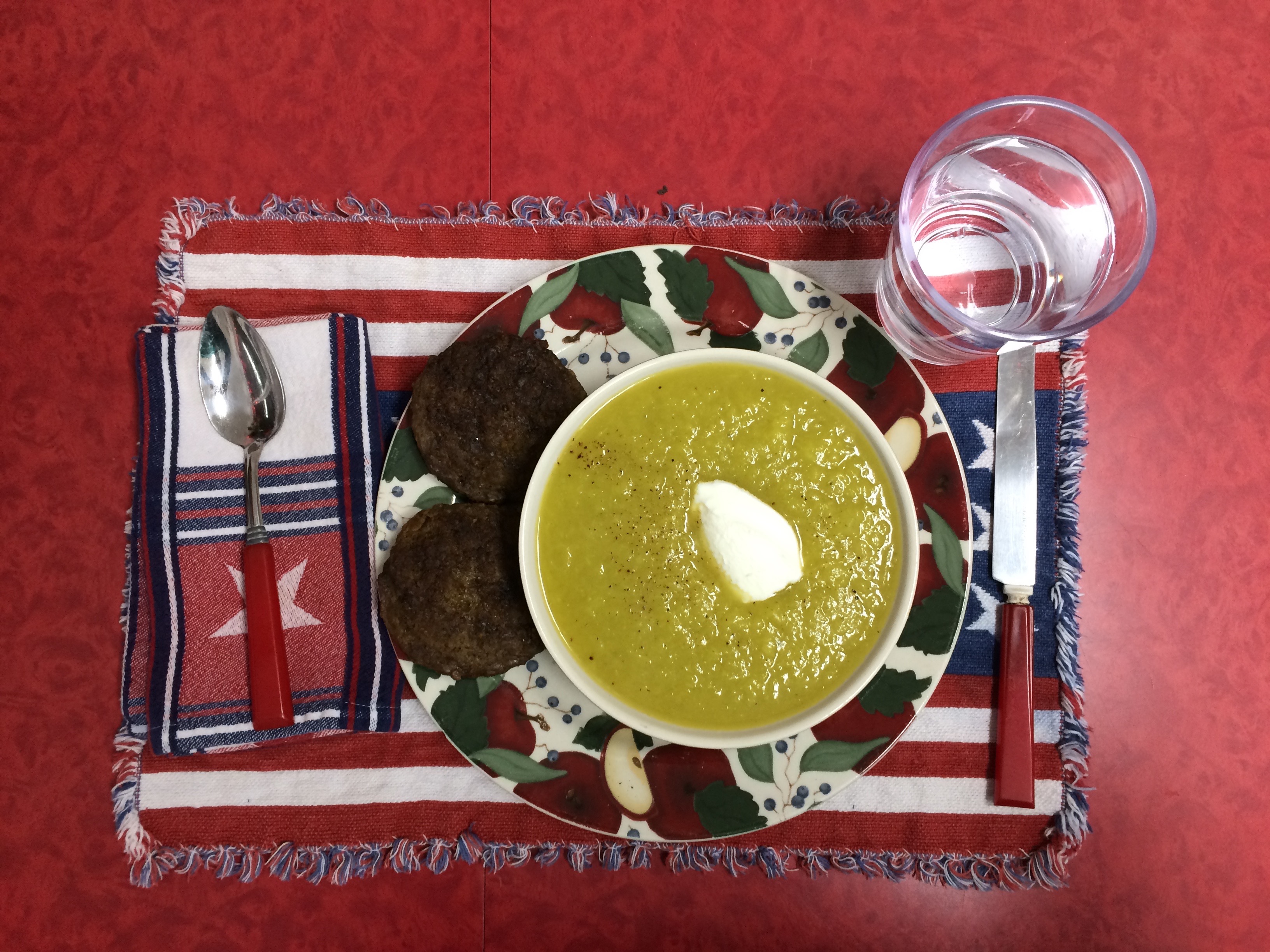 Venison patties are one of my two red meat options. Here, I paired them with homemade broccoli soup with dollop of Greek yogurt and one of the seven bottles of water I drink daily.