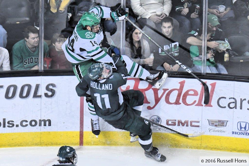 The University of North Dakota men’s hockey team skated to a 2-2 tie with Michigan State University on Saturday night in Ralph Engelstad Arena. The tie came on the heels of a 4-3 defeat to the Spartans on Friday night. Zach Yon and Tucker Poolman scored goals for UND (7-5-3), while Thomas Ebbing and Patrick Khodorenko tallied for MSU (4-6-1). In the second of two overtimes to follow regulation play, MSU freshman defenseman Bob Rosburg scored 58 seconds into a 3-on-3 session, his third goal of the weekend to end the scoring. Cam Johnson had 17 saves in goal for the Fighting Hawks, and Ed Minney had 32 for the Spartans. UND returns to action Dec. 3, when it plays Boston College in New York City’s Madison Square Garden. Check out more photos from Russ Hons here.