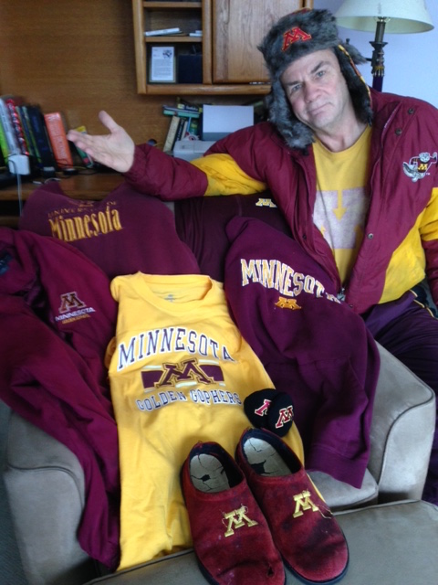 It’s listed on my Facebook and Twitter pages. “Long-suffering Gopher fan. Hopeless Gopher fan…” I admit to owning worn-out maroon slippers with the gold Minnesota logo. They’re so old, the stitching has come loose. Minnesota merchandise is everywhere. My fading gold T-shirt. The heavy Gopher jacket for cold weather games. The lighter, maroon version for early fall. Even the snazzy head gear that makes me look like I’m auditioning for a role in “Fargo.”