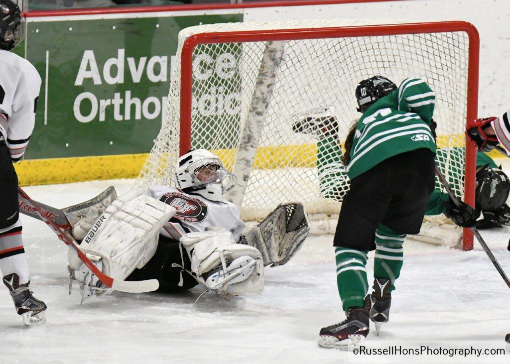 Grand Forks KnightRiders and East Grand Forks Senior High skated to a 3-3 tie in girls high school hockey Tuesday night in Eagles Arena in Grand Forks. Kathleen Petersen scored two goals and Katie Rodningen scored one for Grand Forks (4-7-1), while Tyre Chupka, Kylie Stauss and Madison McDonald scored for the Green Wave (7-4-2). KnightRiders goalie Quinn Kuntz stopped 49 shots, while Senior High goalie Megan Birkholz had 12 saves. (Check out more photos from Russ Hons here.)