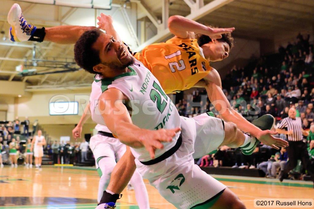 Quinton Hooker scored a game-high 26 points to lead the University of North Dakota men’s basketball team to an 87-77 overtime victory over Northern Colorado in Big Sky Conference action Saturday in Betty Engelstad Sioux Center. The Fighting Hawks (13-8, 8-3 BSC) trailed almost the entire portion of regulation, holding only a 4-2 advantage early in the contest before claiming the win against the Bears (8-14, 4-7 BSC). Four other UND players finished in double figures in scoring. Connor Avants had 15 points, Gino Crandall and Corey Baldwin chipped in 13 and 12 points, respectively, and Cortez Seales added 11. Chaz Glotta led the Bears with 22 points, while Jordan Davis added 18 points and Jonah Radebaugh had 11. UND returns to play next week, hosting Eastern Washington University on Thursday. (Check out more photos from Russ Hons here.)