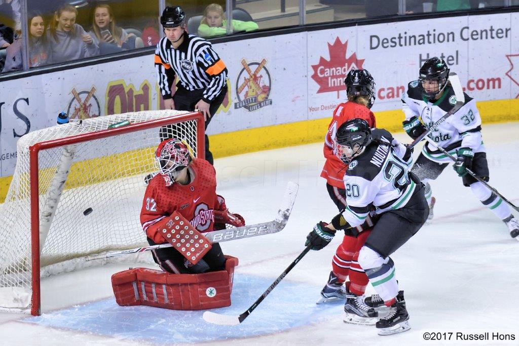 The University of North Dakota women’s hockey team sent its seniors out in style Saturday afternoon in Ralph Engelstad Arena, claiming a 3-2 Western Collegiate Hockey Association win over Ohio State University on Senior Day. Emma Nuutinen, Kayla Gardner and Charly Dahlquist scored for the Fighting Hawks (14-14-6 overall, 11-12-5 WCHA), while Maddy Field and Lauren Boyle had goals for the Buckeyes (13-16-5 overall, 7-16-5-2 WCHA). Annie Chipman and Lexie Shaw combined for 15 saves in goal for UND, while OSU’s Kassidy Sauve stopped 26 shots. UND, which finished fourth in the WCHA, hosts Ohio State (fifth) on Feb. 24-26 in the first round of the WCHA playoffs. (Check out more photos from Russ Hons here.)