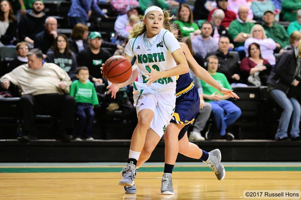 The University of North Dakota women’s basketball team, behind the scoring of seniors Makailah Dyer, Samantha Roscoe and Leah Szabla, defeated the University of Northern Colorado 75-68 on Saturday in Betty Engelstad Sioux Center to move closer to a Big Sky Conference title. Dyer scored 17 points and added 11 rebounds, Roscoe had 14 points and three boards and Szabla chipped in 13 points and six rebounds to move UND to 14-2 in the league play and 19-8 overall. Savannah Scott led the Bears (12-4 BSC, 20-7 overall) with 19 points. Katie Longwell and Courtney Smith added 18 and 14 points, respectively. The Fighting Hawk need just one more win or a Montana State loss to clinch at least a share of the conference’s regular season title. UND heads to Sacramento State and Portland State next week. (Check out more photos from Russ Hons here.)