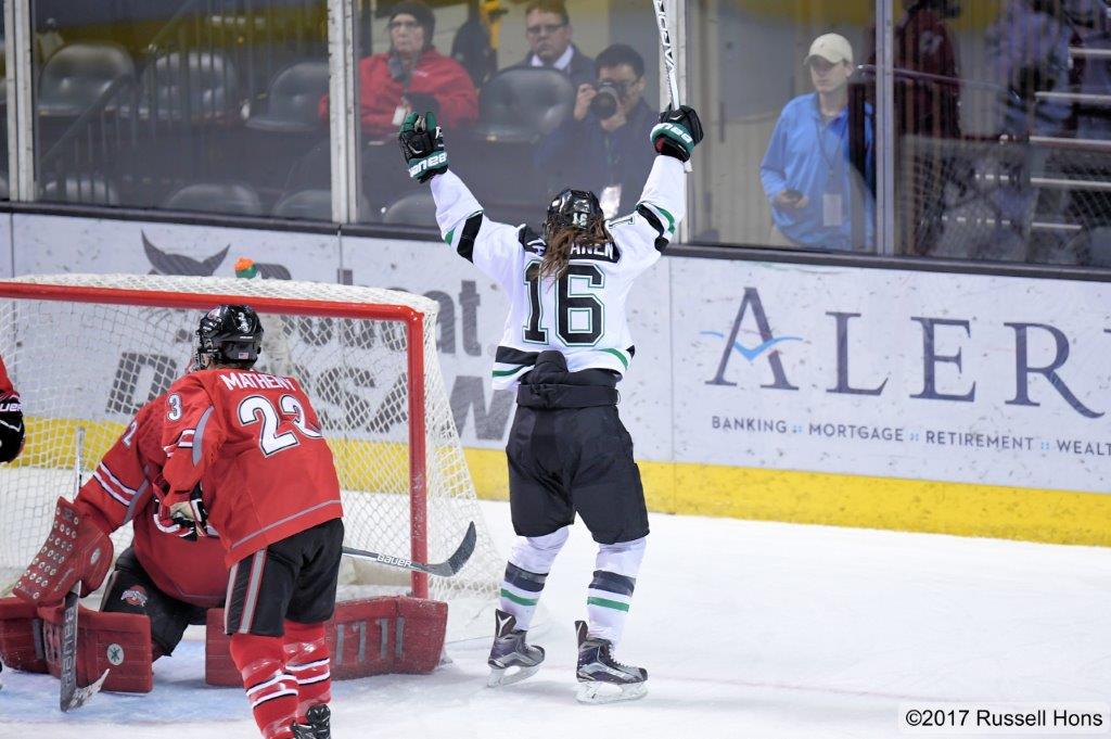 The University of North Dakota women’s hockey team forced a third and decisive game of its Western Collegiate Hockey Association playoff series with a 4-1 win over Ohio State University on Saturday afternoon in Ralph Engelstad Arena. Amy Menke led the Fighting Hawks (15-15-6) with a goal and two assists. Charly Dahlqvist, Vilma Tanskanen and Ryleigh Houston scored the other UND goals. Maddy Field scored the lone goal for the Buckeyes (14-17-5). Goalie Lexie Shaw had 17 saves for UND, while OSU’s Kassidy Sauve stopped 33 shots. The two teams meet again Sunday afternoon. (Check out more photos from Russ Hons here.)