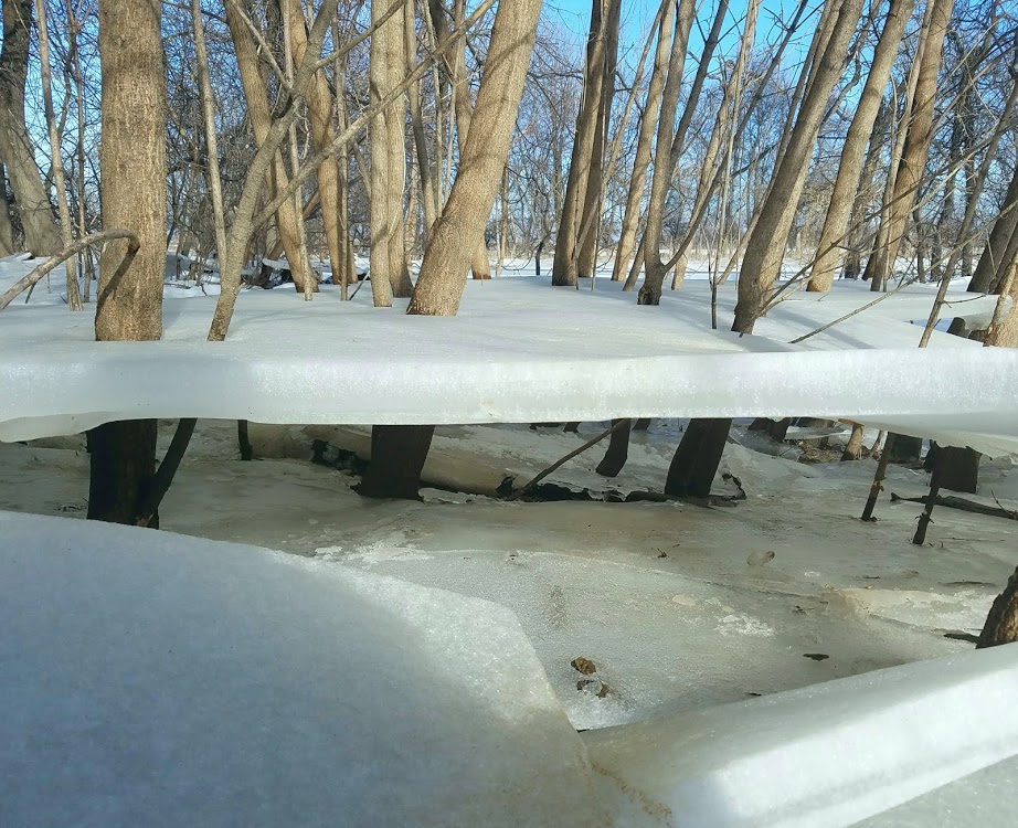 Every once in awhile, the ice cracked beneath my boots. Another step, another crack. Another step and suddenly — woomph! — a swimming pool size slab would drop to the ground. I recalled a little nervously that’s exactly what I felt when I fell through a frozen beaver pond while deer hunting back in the day. Only then, I never touched bottom. On Sunday, the ice and I landed on ground with a thud. The experience was eerily similar, though. After the eighth or ninth time the ice dropped, I couldn’t help but giggle or laugh.