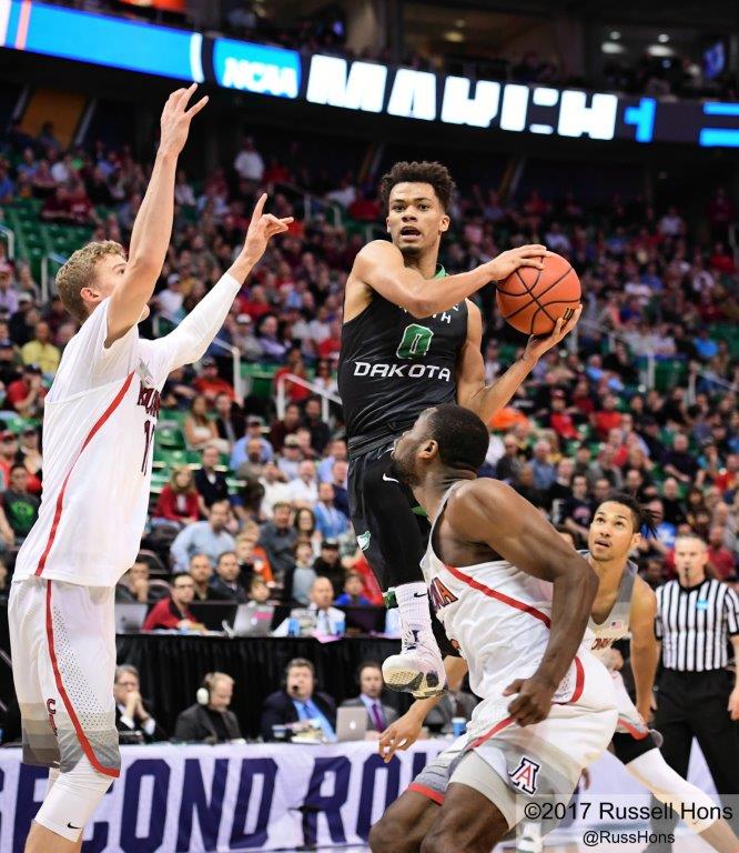 The University of North Dakota men’s basketball team couldn’t overcome a talented University of Arizona squad, dropping a 100-82 decision to the Wildcats Thursday night in the opening round of the NCAA West Regional in Salt Lake City, ending the Fighting Hawks amazing run in the 2016-17 season. The Fighting Hawks (22-10) were led by Quinton Hooker, who scored 25 points, and Drick Bernstine, who added 20 points and a season-high 15 rebounds. Geno Crandall chipped in 12 points and six assists. Corey Baldwin also finished in double figures in scoring with 12 points. Arizona (31-4) was paced by Lauri Markkanen and Rawle Alkins, who each had 20 points. Alonzo Trier added 18 points, and Dusan Ristic had 12 and Kadeem Allen 10. The Wildcats, the Pac-10 regular season and postseason tournament champions, will meet St. Mary’s College (29-4) in the regional’s quarterfinals Saturday. (Check out more photos from Russ Hons here.)