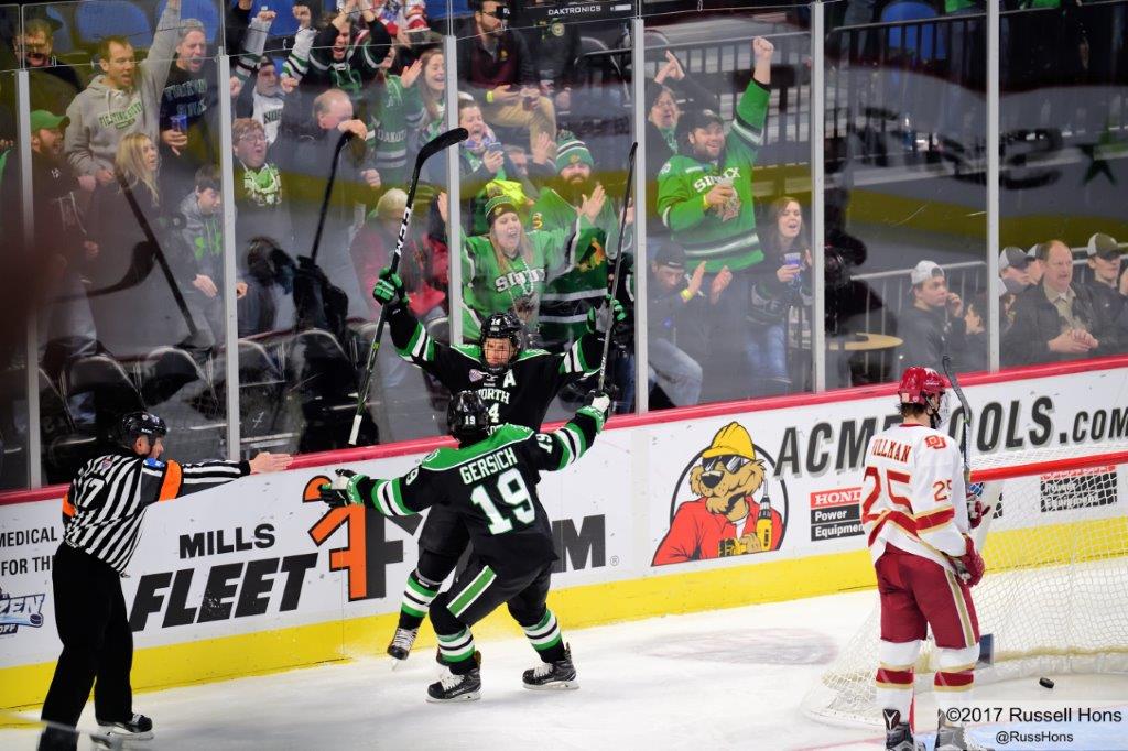 The University of North Dakota men’s hockey team qualified for its 15th straight appearance in the 16-team NCAA Tournament with a 1-0 shutout of Denver University on Friday night in Minneapolis’ Target Center in the semifinals of the National Collegiate Hockey Conference Frozen Four. Austin Poganski’s goal just 2:30 into the third period sealed the win for the Fighting Hawks (21-14-3). UND will play the University of Minnesota-Duluth tonight in the championship game. The Bulldogs (24-6-7) defeated Western Michigan University (22-11-5) 5-2 on Friday afternoon in the other semifinal game. Fighting Hawks goalie Cam Johnson stopped 21 shots, while Tanner Jaillet of DU (28-7-4) had 25 saves. (Check out more photos from Russ Hons here.)