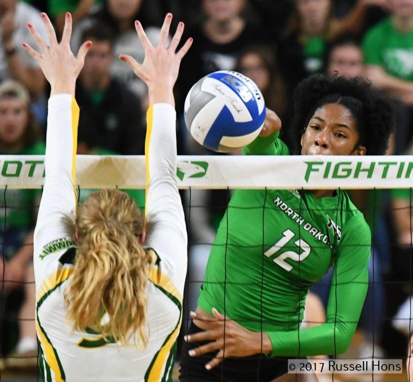 The University of North Dakota women’s volleyball team won its 10th match of the season in 11 tries, topping in-state rival North Dakota State University before a sold-out crowd of 3,140 fans Wednesday night in Betty Engelstad Sioux Center. The Fighting Hawks swept the Bison 25-18, 25-9, 25-13 behind the second-largest crowd in the Betty’s history. Faith Dooley led UND with a team-high nine kills and was supported by Jordan Vail and Ashley Brueggeman, who each added seven kills. NDSU was led by McKenzie Burke, who recorded 13 kills. The Bison fell to 4-3 with the loss. UND returns to action Friday, when it will host George Washington (11:30 a.m.) and Appalachian State (7 p.m.). The Fighting Hawks then play South Dakota State at 11 a.m. Saturday in the Betty.
