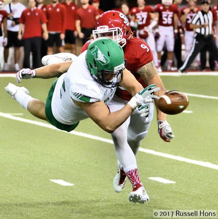 The 10th-ranked University of North Dakota football team was hoping to build on last weekend’s Potato Bowl victory against Missouri State, but the University of South Dakota (3-0) had a different idea as the Coyotes overwhelmed the Fighting Hawks 45-7 before almost 10,000 fans Saturday in the DakotaDome. USD quarterback Chris Streveler, who has won back-to-back Missouri Conference Offensive Player of the Week accolades to start the season, had 49 rushing yards and a touchdown and went 17-for-23 through the air for 241 yards and a score before the break and finished with 352 yards of total offense and accounted for three of the Coyotes’ five touchdowns. USD’s Kai Henry ran for two touchdowns and rushed for a team-high 80 yards on 12 carries.UND (1-2) trailed 31-0 after the first half before scoring its only touchdown in the third quarter, a 10-yard touchdown pass from Keaton Studsrud to Travis Toivonen. John Santiago finished with 85 yards rushing to lead UND, which finished with just 102 total yards on the ground. Studsrud finished 11-for-22 passing for 133 yards. UND opens Big Sky Conference play Saturday when it hosts the Montana State in the Alerus Center. (Check out more photos from Russ Hons here.)