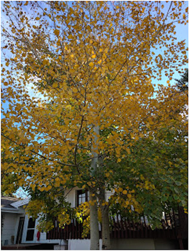 Three of the aspen trees were a gift from dear Sheila Schafer, as a tribute to Jim’s late mother. Sheila came over to watch Cashman Nursery plant the trees. She loved to see trees planted and frequently gave these as memorial gifts to her friends and family. Jim told her these were “big ass aspen,” and she just laughed her unique laugh. I’ve allowed a few of the sprouts to grow to enlarge the grove.”