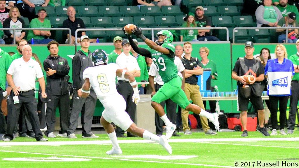 A fourth-quarter comeback fell short for the University of North Dakota football team Saturday in the Alerus Center, as the Fighting Hawks dropped a 34-27 decision to Sacramento State University in a matchup of Big Sky Conference foes. UND (2-6, 1-4 BSC) and Sacramento State (4-3, 3-1 BSC) were tied 10-10 at halftime before the Hornets opened up a 24-10 lead in the third quarter and managed to hold on for the win. UND starting quarterback Keaton Studsrud was 5-for-12 for 80 yards before leaving the game with an injury. Backup quarterback Andrew Zimmerman finished 11-for-20 for 179 yards and two second-half touchdown passes, one to De’mun Mercer (39 yards) and the other to Noah Wanzek (18 yards). Mercer finished the game with five catches for 115 yards. Wanzek caught eight passes for 100 yards. Running back John Santiago rushed for 75 yards on nine carries to lead UND’s ground game. Sacramento State redshirt freshman quarterback Roman Ale, in his first collegiate appearance, completed 13 of 19 passes for 263 yards and two long scoring tosses to wideout Andre Lindsey. UND will be on the road for its next two contests, starting with a Big Sky matchup at Portland State next Saturday. (Check out more photos from Russ Hons here.)
