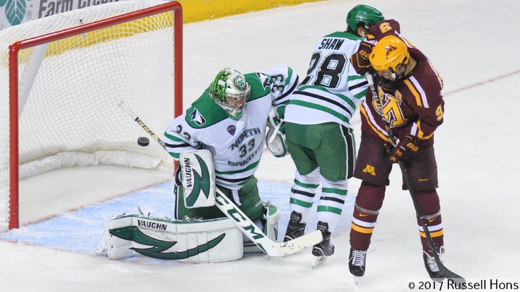 Christian Wolanin scored two goals to lead the University of North Dakota men’s hockey team to a 4-0 win over the University of Minnesota on Saturday night in Ralph Engelstad Arena. The victory for the Fighting Hawks (4-1-1) gave them a split of the weekend series with the Gophers (3-3). Minnesota won the Friday night opener 2-1. Nick Jones and Colton Poolman scored the other UND goals. Fighting Hawks goalie Cam Johnson stopped 22 shots in gaining his 10th career shutout. Minnesota goalie Eric Schierhorn, who stopped 34 of 35 shots Friday, had 14 saves. UND opens NCHC play next weekend at Colorado College. (Check out more photos from Russ Hons here.)