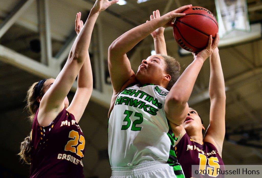 The University of North Dakota women’s basketball team tuned up for its upcoming 2017-18 season opener with a 79-50 exhibition win over the University of Minnesota-Crookston on Wednesday night in Betty Engelstad Sioux Center. The Fighting Hawks were paced by Lexi Klabo, who scored 20 points and grabbed 11 rebounds. Fallen Freije chipped in 17 points and eight reboards for the Fighting Hawks, and transfer Melissa Dailey added in 16 points, six assists and two rebounds. The Golden Eagles were paced by Isieoma Odor, who scored 16 points, and Micaela Noga, who added 12. UND travels to 17th-ranked Oregon State for its regular season opener Friday. (Check out more photos from Russ Hons here.)