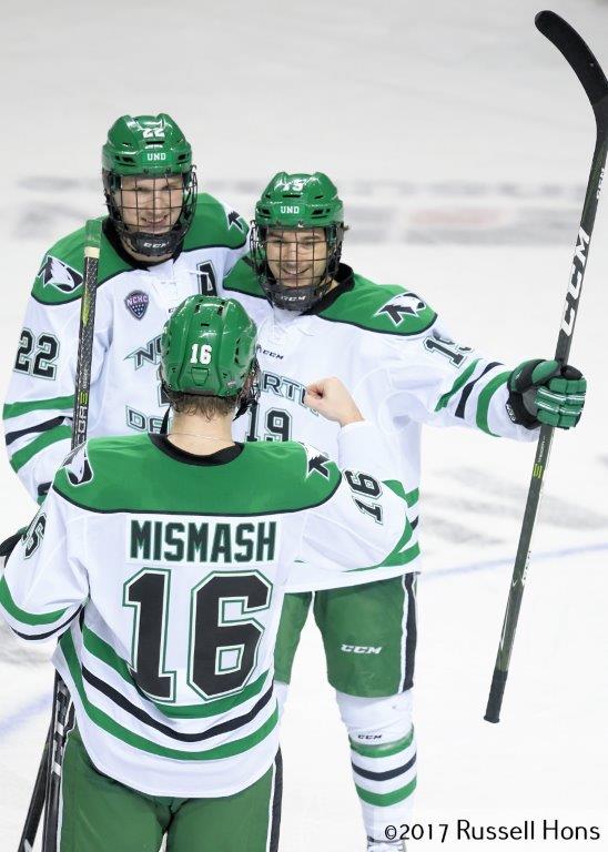 The University of North Dakota men’s hockey team overcame a 2-0 deficit against Miami University on Saturday night in Ralph Engelstad Arena to score a shootout win in National Collegiate Hockey Conference play. The Fighting Hawks (7-2-3 overall, 2-1-1 NCHC) and the RedHawks (4-5-1 overall, 1-2-1 NCHC) were tied 3-3 after regulation and a 5-on-5 5-minute overtime and a 3-minute 3-on-3 session before a Christian Wolanin snapshot beat Ryan Larkin and UND freshman goalie Peter Thome stopped Miami’s Carson Meyer. The shootout win gave UND five of the six points available in the series after Friday’s 4-1 victory. Tucker Poolman, Dixon Bowen and Shane Gersich scored for the Fighting Hawks in regulation, while Gordie Green, Ryan Siroky and Josh Melnick scored for the RedHawks. Thome finished the game with 20 saves, while Larkin stopped 29 shots. UND, with 8 points in league play, is one point out of first place, shared by Colorado College and Western Michigan, with 9 points each. (Check out more photos from Russ Hons here.)