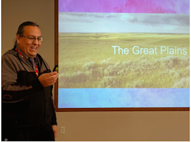 Jim and I took ourselves Wednesday on over to the United Tribes Technical College for a lunchtime program by a member of the faculty there, Dakota Goodhouse. The topic was “The Geography of the Great Plains,” and we knew it would be a worthwhile use of our retired time, not to mention the huge, delicious sloppy Joes we were fed.