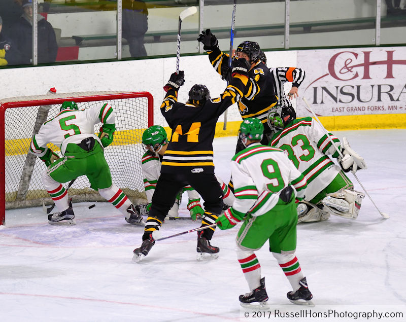 East Grand Forks Senior High and Warroad skated to a 1-1 tie in Minnesota Section 8A high school hockey play Thursday night in the East Grand Forks Civic Center. Landon Parker scored for the Green Wave (6-4-1), while Kip Knutson scored for the Warriors (2-6-1). Goalie Carter Krier stopped 23 shots for No. 5-ranked East Grand Forks. Warroad goalie Max Gausen finished with 27 saves. (Check out more photos from Russ Hons here.)