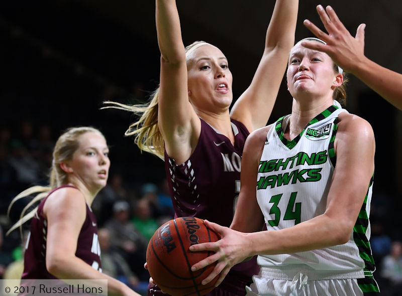 The University of Montana snapped the University of North Dakota women’s basketball team’s 11-game home winning streak with a 54-43 Big Sky Conference victory over the Fighting Hawks on Thursday night in Betty Engelstad Sioux Center. The Grizzlies (7-7 overall, 3-0 BSC) were led by Caitlin Lonergan, scored a 12 points and McKenzie Johnston who added nine points and eight rebounds. Lexi Klabo, who went 10-for-16 from the floor, led the Hawks (7-7 overall, 0-3 BSC) with a game-high 21 points. Fallyn Freije added seven points and nine rebounds. UND return to action Saturday when it hosts Montana State University at 2 p.m. Saturday. (Check out more photos from Russ Hons here.)