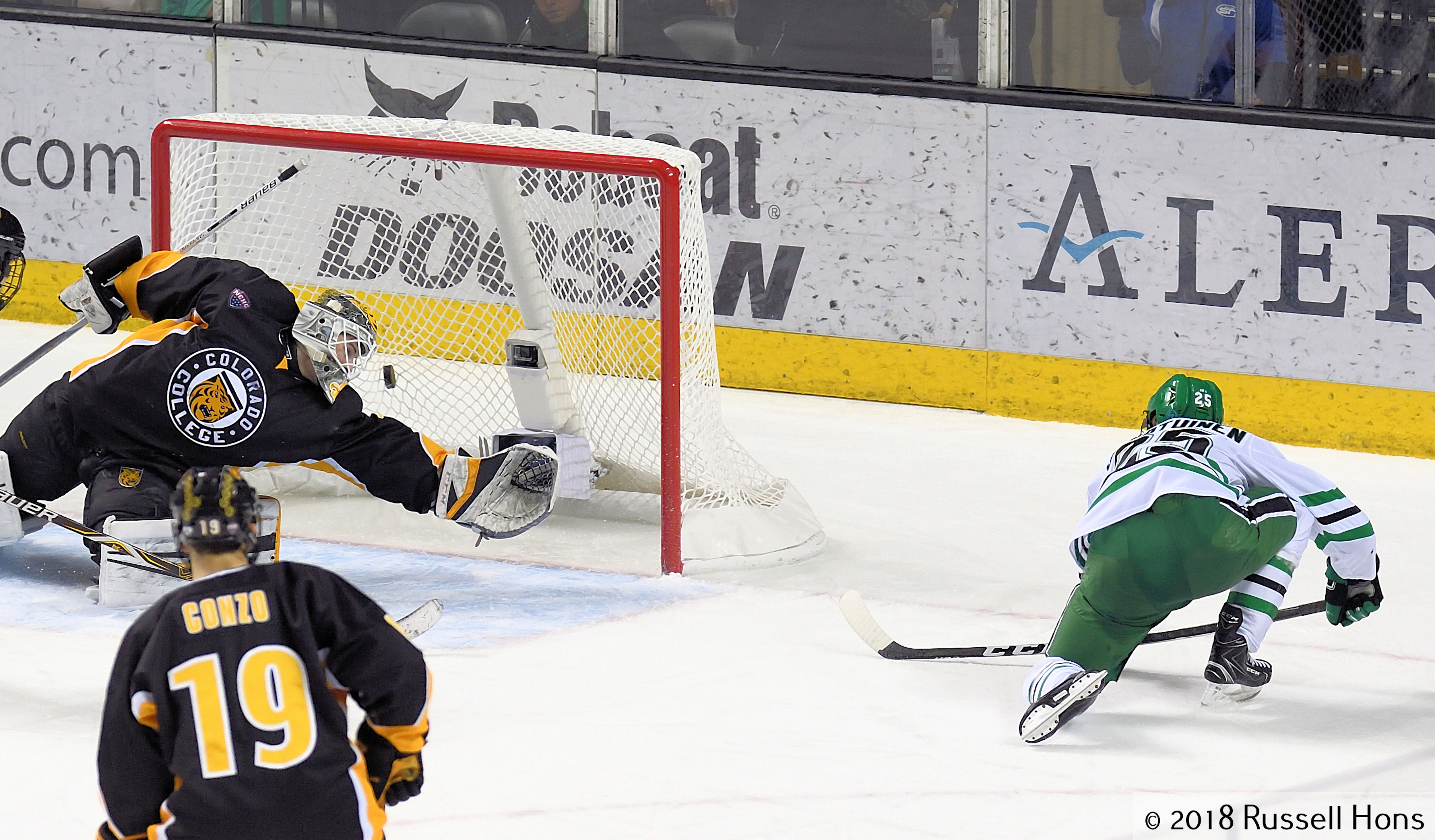 The University of North Dakota men’s hockey team gained a weekend split with Colorado College with a 5-1 National Collegiate Hockey Conference win Saturday night in Ralph Engelstad Arena. The Tigers won 4-2 Friday night. The win put UND in a tie for third place in the NCHC with Western Michigan University and snapped a six-game winless streak. The Fighting Hawks (13-9-8 overall, 7-7-4 NCHC) received two goals Joel Janatuinen and singles from Rhett Gardner, Austin Poganski and Grant Mismash. Nick Halloran scored the only goal fort the Tigers (12-12-4 overall, 6-9-3 NCHC). UND goalie Peter Thome stopped 20 shots, while CC’s Alex LeClerc had 25 saves. (Check out more photos from Russ Hons here.)