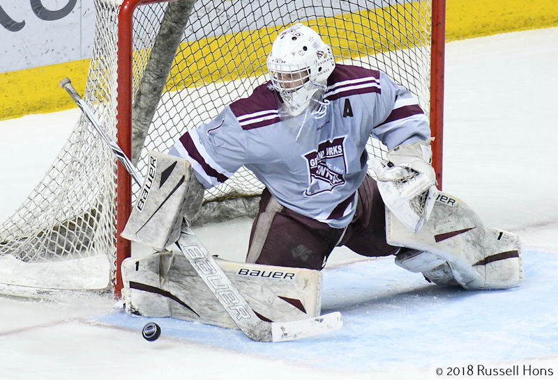 Goalie Kaleb Johnson recorded his fifth straight shutout and William Lawson-Body scored two goals to lead Grand Forks Central boys hockey team to a 7-0 win over Grand Forks Red River in the semifinals of the North Dakota High School Hockey Tournament on Friday night in Ralph Engelstad Arena. The win for the Knights (23-1-2) sets up today’s championship game with Bismarck Century. Zach Murphy, Cole Hanson, Mitchell Idalski, Lucas Kanta and Jeffrey Hendrickson also scored for Central. Red River dropped to 20-4-2 and will meet Fargo Davies in the third-place game. (Check out more photos from Russ Hons here.)