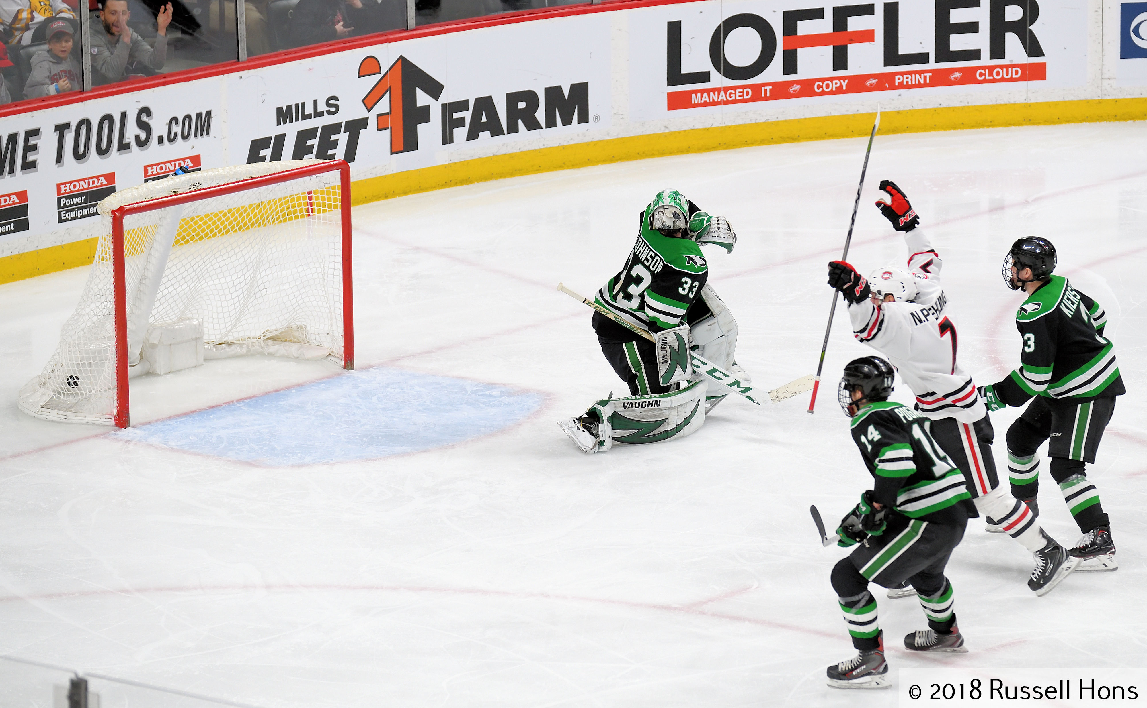 St. Paul, MN; March 16, 2018; NCHC Frozen Faceoff, Xcel Energy Center. The University of North Dakota Fighting Hawks took on St. Cloud State Friday afternoon and once again went to OT, with St. Cloud winning 4-3. Photo by Russell Hons