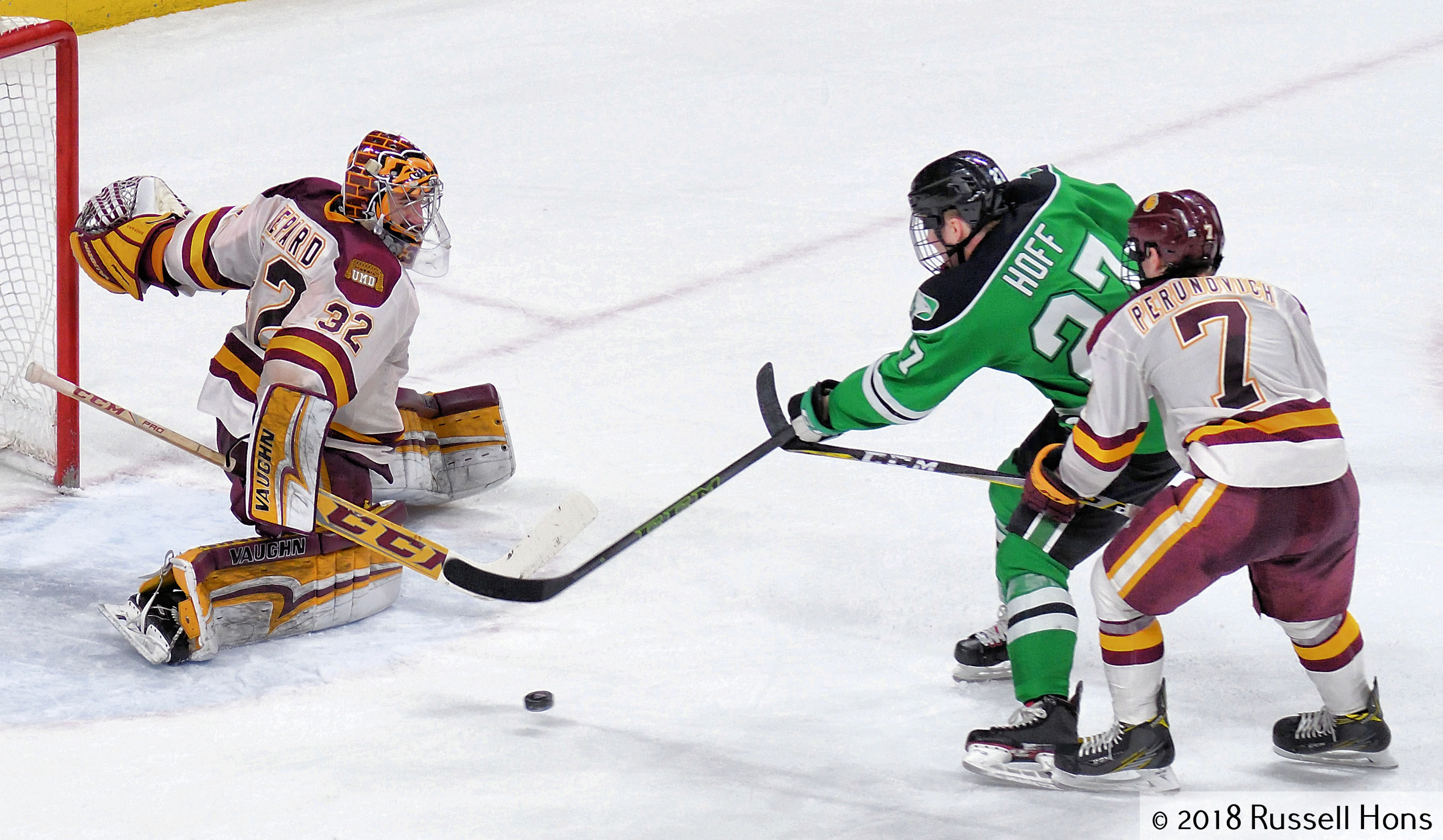 St. Paul, MN; March 17, 2018; NCHC Frozen Faceoff, Xcel Energy Center. University of North Dakota vs Minnesota Duluth. 3rd place game. Photo by Russell Hons