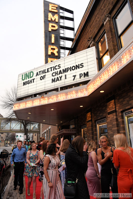 Grand Forks photographer attended the University of North Dakota Athletics Night of Champions awards banquet Tuesday night in the Empire Arts Center in downtown Grand Forks. Among the winners were University of North Dakota junior thrower Molli Detloff and junior defenseman Christian Wolanin. Detloff was named the Grace Rhonemus Female Athlete of the Year, and Wolanin was named UND’s Glenn “Red” Jarrett Male Athlete of the Year. For a full listing of award winners, go here. (Check out more photos from Russ Hons here.)