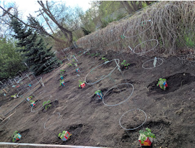 The seedlings we started in the furnace room are thriving and Jim has given away all of his surplus tomatoes. He was so eager to get these planted and did so — 25 planted Monday. I’m the more cautious gardener and wait until late in May for my flower seedlings. Because these annuals are in an unfenced area, I have to wait until the seedlings are fairly large in the hopes that the rabbits won’t munch ‘em.