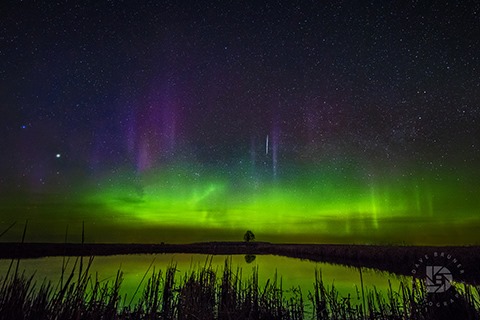 “It was a beautiful site to witness and photograph as they displayed rising pillars, swirling lines and the colors of green, yellow, purple and reddish pink. Some meteors also were shooting across the sky and were captured in some of the images. I used this pond and tree as foreground, with the tree giving a scale to the scene of this large sky display.”