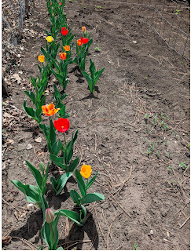 The tulip strategy I used last fall, planting a row within the vegetable garden fence in order to foil the rabbits, worked perfectly, a cheerful row of bright colors.