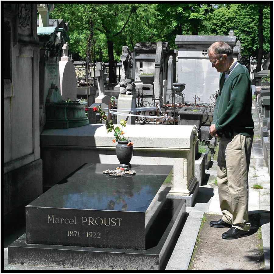 No, Hemingway is not there (look for his grave in Ketchum, Idaho). But Marcel Proust, the author of “In Search of Lost Time,” is. Dorette took this picture in 2005 of me paying respects at his grave.