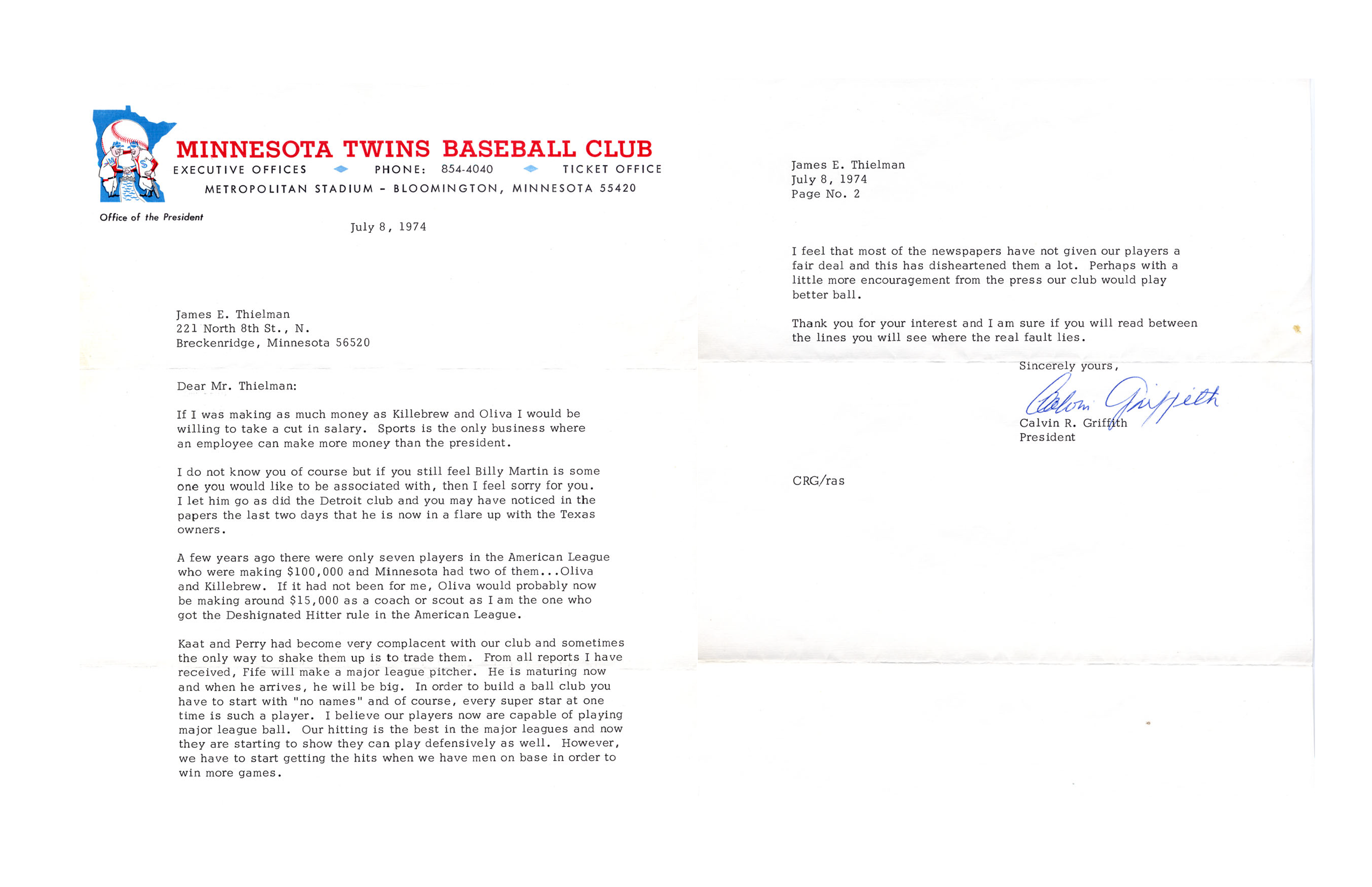 Twins President Calvin Griffith letter to Jim Thielman – July 1974
