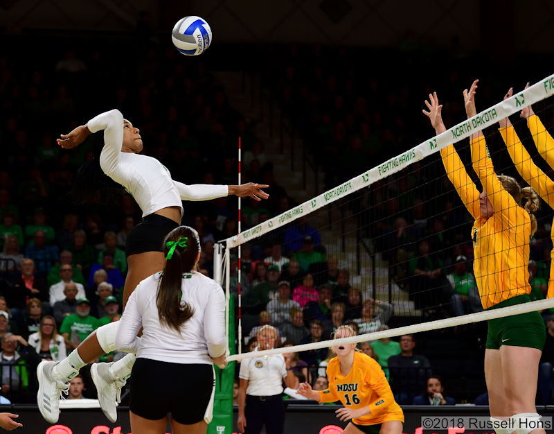 September 26, 2018: The North Dakota State University Bison meet the University of North Dakota Fighting Hawks in Summit League women’s volleyball at the Betty Engelstad Sioux Center in Grand Forks, North Dakota. North Dakota wins 3-2 over North Dakota State. Russell Hons