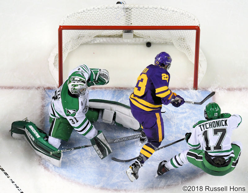 Max Coatta scored three goals to lead No. 7-ranked Minnesota State University-Mankato to a 7-4 win over the University of North Dakota on Friday night in Ralph Engelstad Arena. The Fighting Hawks (0-2-1) jumped out to a 2-1 lead just 2:44 into the first period, but a checking from behind major penalty and an automatic game disqualification against captain Rhett Gardner gave the Mavericks (3-0) a five-minute power play. Coatta scored his first goal on the ensuing power play to tie the game. The Mavs then outscored poured in four second-period goals to only two by the Hawks to jump to a 6-4 lead before adding their seventh goal in the third period. Collin Adam, Zach Yon, Matt Kierstad and Ludvig Hoff were the UND goal scorers. Parker Tuomie added two goals and an assist and Marc Michaelis had a goal and an assist for the Mavericks. UND starting goalie Peter Thome was pulled just 2:07 into the second period. He gave up four goals on 10 shots. Adam Scheel relieved Thome, giving up two goals on 10 shots. Dryden McKay had 34 saves in goal for the Mavs. The two teams meet again tonight. (Check out more photos from Russ Hons here.)